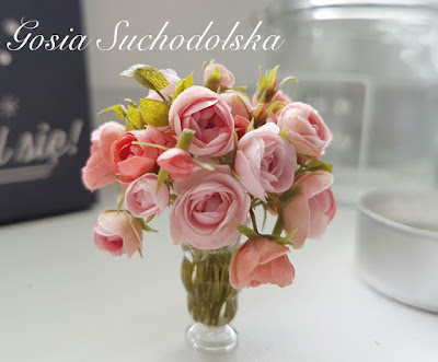 To zamówienie czekało na realizacje bardzo długo. Pani przysłała mi zdjęcie obrazu, który ma nad kominkiem w swoim domku. Na obrazie jest kobieta w szacie z rękawami w takich właśnie odcieniach różu. Oczywiście muszę jeszcze dorobić liście i parę opadłych płatków. Plus woda w wazonie i wszelkie konieczne poprawki. Ale skoro już są, nie umiałam się oprzeć pokusie zabawy "w domek dla lalek". Ale miło.... kawa, aparat fotograficzny, luz i miniaturki. uff, znowu wiem, że żyję :)